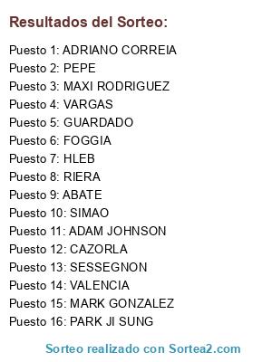 Lista de participantes: HLEB, VARGAS, VALENCIA, SESSEGNON, CAZORLA, ADAM JOHNSON, GUARDADO, FOGGIA, MAXI RODRIGUEZ, ADRIANO CORREIA, PARK JI SUNG, SIMAO, PEPE, RIERA, MARK GONZALEZ, ABATE.
