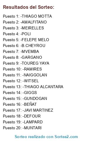 Lista de participantes: -GIGGS, -THIAGO ALCANTARA, -AMALFITANO, -B.CHEYROU, -POLI, -JAVI MARTINEZ, -THIAGO MOTTA, -MEIRELLES, -GUNDOGAN, -WITSEL, -TOUREG YAYA, -GARGANO, -MVEMBA, -MUNTARI, -LAMPARD, -BEÑAT, -RAMIRES, -NAIGGOLAN, -FELEPE MELO, -DEFOUR.