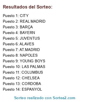 Lista de participantes: AT.MADRID, BAYERN, YOUNG BOYS, CHELSEA, COLUMBUS, CORDOBA, ALAVES, BARÇA, JUVENTUS, CITY, NAPOLES, ESPANYOL, REAL MADRID, LAS PALMAS.