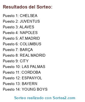 Lista de participantes: AT.MADRID, BAYERN, YOUNG BOYS, CHELSEA, COLUMBUS, CORDOBA, ALAVES, BARÇA, JUVENTUS, CITY, NAPOLES, ESPANYOL, REAL MADRID, LAS PALMAS.