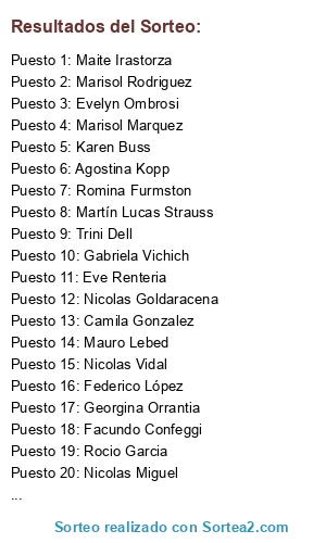 Lista de participantes: Santiago Christiansen, Matias Miguel, Rocio Garcia, Pedro Gonzalez, Camila Erdozaincy, Martina Garcia, Federico Vasquez, Romina Orrantia, Kevin Nielsen, Roberto Martinez, Emanuel Falcon, Georgina Orrantia, Florencia Andrada, Ivan Jara, Jonathan Molina, Mariana Cordoba, Ana Paula Arguello, Nadia Castro, Evelyn Ombrosi, Katja Schlitter, Belen Dell, Emiliano Jara, Natalia Adad, Melina Carrizo, Cinthia Lascano, Mauro Lebed, Micaela Rodriguez, Joaquin Rodriguez, Facundo Dauphin, Daiana Cadena, Luisina Perfetto, Agustina Guineo, Wanda Lantz, Florencia Leguizamon, Guillermina Sartison, José Manuel Larralde, Aymara Luna, Sabrina Grosso, Florencia Procupez, Natalia Torres, Matias Stacco, Eliseo Acosta, Marcelo Vichich, Cintia Muanna, Adrian Olazabal, Sofia Fercsik, Walter Conrat, Brenda Lambrecht, Amira Yunis, Franco Dall, Julian Yunis, Camila Gonzalez, Analuz Gonzalez, Juan Jose Caro Longarini, Gabriela Vichich, Ailen Bigi, Fatima Gonzalez, Juan Cerritelli, Damian Garnica, Francis Hernan Krenz, Facundo Germani, Eliana Haag, Rocio Nuñez, Luján Apablaza, Mayra Fernández, Nicolas Vidal, Aldana Abas, Cristian Gioventu, Eve Renteria, Leiza Perez, Manuel Vacas, Alejandra Fernandez, Julian Gonzalez, Agostina Kopp, Rocio Sanchez, Maite Irastorza, Federico Almaraz, Brenda Arismendi, Braian Colombil, Jazmin Quevedo, Mariana Cancelas, Graciela Falcón, Antonela Falcón, Celeste Pazos, Marisol Marquez, Gabriela Pazos, Yamila Pazos, Belen Hernandez, Milton Fogel, Karen Buss, Gimena Aranda, Abigail Altamirano, Nadia Altamirano, Maria Burgos, Joaquin Estanga, Martín Lucas Strauss, Maximiliano Sartison, Daiana Apablaza, Jesus Garcia, Nadia Ferenz, Tamara Valladares, Berta Grassi, Jennifer Contreras, Facu Raab, Ale Mujica, Agostina Alvarez, Carlitos Leon, Tomás Acuña, Nicolàs Barrios, Lucas Dominici, Romina Morales, Cristian Confeggi, Facundo Confeggi, Cintia Quintero, Marianel Holmann, Juany Soulee, Leonardo Gonzalez, Lorena Choquevilca, Eva Gerrero, Jorge Soule, Carla Fernandez, Damian Cegarra, Abigail Schlitter, Facundo Pedraza, Juany Ricagno, Marcos Holmann, Carla Kunisch, Fabricio Colombil, Julian Rap, Florencia Montico, Mariano Emanuel Barga, Matias Soulé, Juan Hitce, Maira Czelej, Loana Muñoz, Leticia Unibaso, Joana Castro, Daniel Castro, Federico López, Nicolas Goldaracena, Hernan Goldaracena, Nicolas Germani, Paula Fernandez, Ceci Resch, Marcos Guerrero, Trini Dell, Manón Gioventú, Facundo Mussari, Alan Acosta, Amadio Facundo, Florencia Acevedo, Micaela Astudillo, Marisol Rodriguez, Deysi Ovando, Mauro Germani, Paula Navarro, Gabriela Stach, María Isabel Ullmann, Jazmin Alessandrini, Adrian Garcia, Nicolas Miguel, Franco Abraham, Rocio Martinez, Fiona Benedetti, Sergio Cutipa, Micaela Gonzalez, Sabrina Gonzalez, Debora Kopp, Agustin Sandoval, Romina Furmston, Braian Aban.