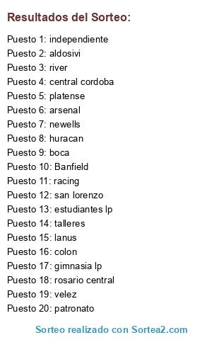Lista de participantes: Banfield, arsenal, patronato, aldosivi, lanus, san lorenzo, talleres, boca, racing, newells, central cordoba, independiente, velez, rosario central, colon, estudiantes lp, river, platense, huracan, gimnasia lp.