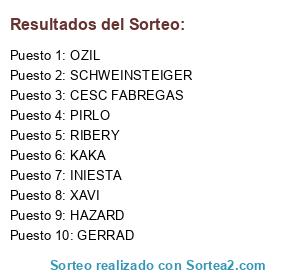 Lista de participantes: XAVI, INIESTA, CESC FABREGAS, GERRAD, PIRLO, RIBERY, KAKA, OZIL, SCHWEINSTEIGER, HAZARD, .