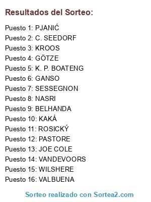 Lista de participantes: VALBUENA, VANDEVOORS, KAKÁ, K. P. BOATENG, PASTORE, NASRI, KROOS, C. SEEDORF, JOE COLE, WILSHERE, PJANIĆ, SESSEGNON, ROSICKÝ, BELHANDA, GÖTZE, GANSO, .