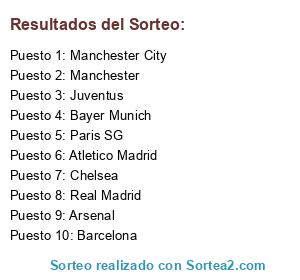 Lista de participantes: Real Madrid, Barcelona, Atletico Madrid, Bayer Munich, Juventus, Arsenal, Paris SG, Manchester City, Chelsea, Manchester, .