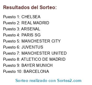Lista de participantes: BARCELONA, REAL MADRID, ATLETICO DE MADRID, BAYER MUNICH, PARIS SG, ARSENAL, CHELSEA, MANCHESTER UNITED, MANCHESTER CITY, JUVENTUS.
