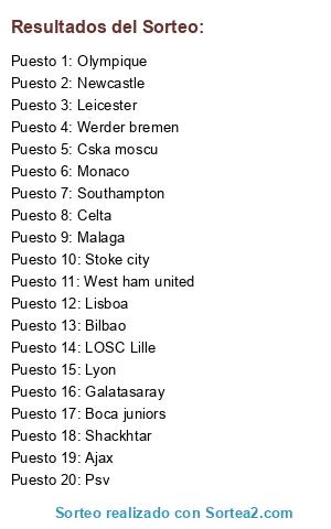 Lista de participantes: Werder bremen, Galatasaray, Bilbao, Monaco, Malaga, Olympique, Ajax, Psv, Southampton, Leicester, West ham united, Lyon, Lisboa, Shackhtar, Cska moscu, LOSC Lille, Boca juniors, Celta, Newcastle, Stoke city.