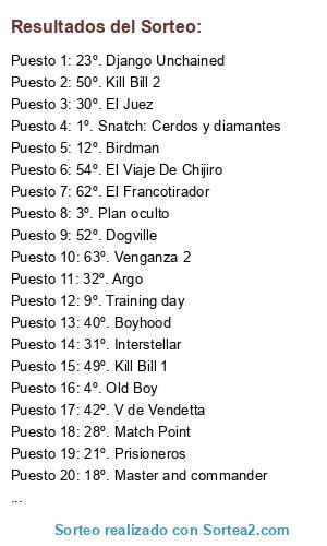 Lista de participantes: 1º. Snatch: Cerdos y diamantes, 2º. Rocknrolla, 3º. Plan oculto, 4º. Old Boy, 5º. Ciudad de Dios, 6º. Drive, 7º. El lobo de Wall Street, 8º. Mystic River, 9º. Training day, 10º. Gravedad, 11º. Dallas Buyers Club, 12º. Birdman, 13º.Mulholland Drive, 14º. Al oeste de los railes, 15º. Reyes y reina, 16º. Cisne Negro, 17º. La isla minima, 18º. Master and commander, 19º. Bronson, 20º. Gran Torino, 21º. Prisioneros, 22º. Los Vengadores, 23º. Django Unchained, 24º. Gladiator, 25º. El Curioso caso de Benjamin Button, 26º. Million Dollar Baby, 27º. Whiplash, 28º. Match Point, 29º. Lincoln, 30º. El Juez, 31º. Interstellar, 32º. Argo, 33º. Collateral, 34º. Catch Me If You Can, 35º. Moon, 36º. Primer, 37º. Coherence, 38º. El Caballero Oscuro, 39º. Mad Max, 40º. Boyhood, 41º. Origen, 42º. V de Vendetta, 43º. El Discurso Del Rey, 44º. La Isla Siniestra, 45º. Persepolis, 46º. Watchmen, 47º. Sin City, 48º. Arma Fatal, 49º. Kill Bill 1, 50º. Kill Bill 2, 51º. Avatar, 52º. Dogville, 53º. La Vida De Adelle, 54º. El Viaje De Chijiro, 55º. El Secreto De Sus Ojos, 56º. The Prestige, 57º. El Hombre Que Nunca Estuvo Alli, 58º. Ocean´s Eleven, 59º. El Viento Se Levanta, 60º. A propósito de Llewyn Davis, 61º. Calvary, 62º. El Francotirador, 63º. Venganza 2, 64º. Spiderman 1.