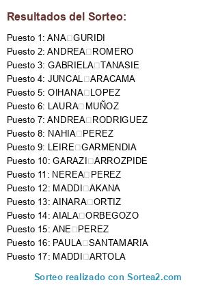 Lista de participantes: AINARA ORTIZ, ANA GURIDI, LEIRE GARMENDIA , NEREA PEREZ, ANDREA RODRIGUEZ, ANDREA ROMERO, MADDI ARTOLA, MADDI AKANA, GABRIELA TANASIE, OIHANA LOPEZ, ANE PEREZ, PAULA SANTAMARIA, GARAZI ARROZPIDE, JUNCAL ARACAMA, NAHIA PEREZ, AIALA ORBEGOZO, LAURA MUÑOZ, .