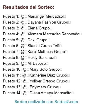 Lista de participantes: @Andrea Grupo, @Zahiry Cena, @Diana Amaya Mercadito, @Enyimars Grupo, @Nemesis Grupo, @Anny Mercadito 1, @Skarlet Grupo Telf, @Ari Mercadito, @Ary Romero, @Alex Mercadito 2, @Yulimar Herrera Grupo, @Egciret Grupo @, @Yulia González Merc1, @Sally Nuevo, @Elena Grupo, @Edgar Grupos, @Yelitza Polanco Grupo, @Joha Adm, @crital grupo, @Lilibeth Pollos Grupo, @Esther Grupo, @Mariangel Mercadito, @Yoha Samuel Merca 1, @Dayana Fashion Grupo, @Yole Mer 1, @Maybel Meec1, @Sandra Del Valle Merc 1, @Marianela Grupo, @Isvveth Bermúdez Mer1, @Nelva Grupo, @Diagny Lares Grupo, @Evelin Imprecolor, @Taxi De Daniel Mercadito 2, @Karol Matheus Grupo, @Paola Grupo, @Wilmi Mer1, @Vero Merc1, @Wendy Grupo Bombona, @Yajaira Gutiérrez Mer1, @Jeimy Grupo, @Yoliber Crespo Grupo, @Eglis Mercaditos, @Chica Viaje, @Venessa Mercadito 2, @Emma Grupo, @Katherine Diaz Grupo, @Heidy Sanchez, @José Miguel Gutiérrez, @Yelitza Grupo, @CARLOS SANZ LOCUTOR, @El Pana 😎edixo, @Elvira, @Xiomara Mercadito Renovado, @Belkis Grupo, @Mi Esposo, @Karen Boscan Grupo, @Johha Grupo, @Marierbis Gomez Grupo, @Anyie Mercadito 2, @Yulis Grupo, @Mora Grupo, @Jennifer Paredes Mercadito, @Kimberly Grupo, @Andrea Cumare Grupo, @Mary Soto Grupo, @Irayda Mercadito, @Lulu Grupo, @Carolina Mundo Casero, @Dexi Grupo, @Marianela Merc2, @Sherley Mercadito, @Mariann Mercadito2, @Yelisbeth Mosquera Mercadito 2, @arminda Grupo, @Ana Gonzalez Grupo, @Farmacia Las 4y Y Num2, @Familia Reyes Soto MERCADITO, @Maidy Muñoz Mercadito, @Yusmaira Grupo, @Viveres elisbethe Productos, @Erika Piña Grupo, @Carmela Movistar, @Marisol Grupo, @Xiomara Ventas Ipas.