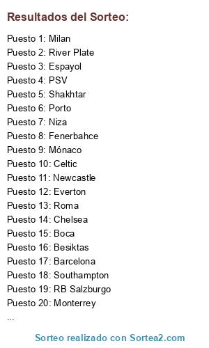 Lista de participantes: Milan, Mónaco, Roma, Atlético Madrid, Besiktas, Boca, Celtic, Chelsea, Espayol, Everton, Barcelona, Fenerbahce, Monterrey, Newcastle, Niza, Porto, PSV, RB Salzburgo, River Plate, Shakhtar, Slavia Praha, Southampton, Vélez, Wolfsburg.
