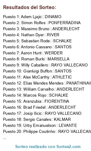 Lista de participantes: Gareth Bale SANTOS, Alessio Cerci SANTOS, Aaron Cresswell SANTOS, Antonio Cassano SANTOS, Antonio Luna SANTOS, Christian Maggio SANTOS, Clemente Rodriguez SANTOS, Doris Salomo Fuakuputu SANTOS, Dede SANTOS, Gianluigi Buffon SANTOS, Hajime Hosogai SANTOS, Ivan Rakitic SANTOS, Lerin Duarte SANTOS, Luiz Gustavo Dias SANTOS, Martin Caceres SANTOS, Nacho Martinez SANTOS, Neymar SANTOS, Osvaldo Alonso SANTOS, Ralf Fahrmann SANTOS, Ricardo Quaresma SANTOS, Robert Lewandowski SANTOS, Ronaldinho SANTOS, Sherman Cardenas SANTOS, Stefan Radu SANTOS, Tiago Ilori SANTOS, Vlad Chiriches SANTOS, Zlatan Ibrahimovic SANTOS, Marc-Andre ter Stegen SHAKHTAR, Renan do Santos SHAKHTAR, Nedum Onuoha SHAKHTAR, Lucas Digne SHAKHTAR, Mattia De Sciglio SHAKHTAR, Matthias Ginter SHAKHTAR, Sylvain Distin SHAKHTAR, Mats Hummels SHAKHTAR, Fabian Schar SHAKHTAR, Pedro Obiang SHAKHTAR, Marco Verratti SHAKHTAR, Aaron Ramsey SHAKHTAR, Paulinho SHAKHTAR, Markovic SHAKHTAR, Aquino SHAKHTAR, Adel Taarabt SHAKHTAR, Juan Fernando Quintero SHAKHTAR, Lucas Piazon SHAKHTAR, Domenico Berardi SHAKHTAR, Raheem Sterling SHAKHTAR, James Rodriguez SHAKHTAR, Luis Suarez SHAKHTAR, Jozy Altidore SHAKHTAR, Lorenzo Insigne SHAKHTAR, Alvaro Morata MARSELLA, Bernd Leno MARSELLA, Chris Smalling MARSELLA, Cristian Rodriguez MARSELLA, Cristian Zapata MARSELLA, Isco Alarcon MARSELLA, Kelvin Mateus de Oliveira MARSELLA, Konstantinos Mitroglou MARSELLA, Marco Reus MARSELLA, Matheus Doria MARSELLA, Mauricio Isla MARSELLA, Memphis Depay MARSELLA, Nacho Fernandez MARSELLA, Paul Pogba MARSELLA, Roman Burki MARSELLA, Ross Barkley MARSELLA, Steven Caulker MARSELLA, Tonny Trindade de Vilhena MARSELLA, Dennis Aogo MARSELLA, Alex Rodrigo MARSELLA, Danilo Luiz MARSELLA, Alexandre Lacazette SCHALKE, Aymen Abdennour SCHALKE, Benoit Costil SCHALKE, Carlos Bacca SCHALKE, Fernando Lucas Martins SCHALKE, Ivan Perisic SCHALKE, Jean-Armel Kana-Biyik SCHALKE, Jonathan Pitroipa SCHALKE, Kevin Theophile-Catherine SCHALKE, Mame Diouf SCHALKE, Marcos Rojo SCHALKE, Mario Mandzukic SCHALKE, Nicola Leali SCHALKE, Nenad Tomovic SCHALKE, Sofiane Feghouli SCHALKE, Ricardo Van Rhijn SCHALKE, Romain Alessandrini SCHALKE, Sebastian Rode SCHALKE, Serge Aurier SCHALKE, Siem De Jong SCHALKE, Stephane Ruffier SCHALKE, Yann M'Vila SCHALKE, Adil Rami ANDERLECHT, Alex Sandro Lobo Silva ANDERLECHT, Dimitar Berbatov ANDERLECHT, Maximilian Arnold ANDERLECHT, Brad Friedel ANDERLECHT, Clement Grenier ANDERLECHT, Ezequiel Lavezzi ANDERLECHT, Fabio Deivson Lopes Maciel ANDERLECHT, German Denis ANDERLECHT, Joao Miranda de Souza ANDERLECHT, Marco Sau ANDERLECHT, Marcos (Marquinhos) Aoas Correa ANDERLECHT, Massimo Bruno ANDERLECHT, Mathew Ryan ANDERLECHT, Matias Suarez ANDERLECHT, Nuri Sahin ANDERLECHT, Sebastian Jung ANDERLECHT, Serigne Kara Mbodj ANDERLECHT, Aaron Lennon ANDERLECHT, Leroy Fer ANDERLECHT, William Carvalho ANDERLECHT, Daniele De Rossi ANDERLECHT, Andres Fernandez SWANSEA, Daniel Carvajal SWANSEA, Ashley Williams SWANSEA, Jan Vertonghen SWANSEA, Alberto Moreno SWANSEA, Mikel Arteta SWANSEA, Koke Resurrección Merodio SWANSEA, Iker Muniain SWANSEA, Kevin De Bruyne SWANSEA, Jese Rodriguez SWANSEA, Stevan Jovetic SWANSEA, Joel Robles SWANSEA, Alvaro Gonzalez SWANSEA, Diego Reyes SWANSEA, Luis Pedro Cavanda SWANSEA, Carlos Henrique Casemiro SWANSEA, Vicente Iborra SWANSEA, Marko Marin SWANSEA, Leo Baptistao SWANSEA, Adrian San Miguel del Castillo BETIS, Alejandro Arribas BETIS, Alvaro Vadillo BETIS, Bruno Alves BETIS, Cedric Soares BETIS, Didac Vila BETIS, Diego Costa BETIS, Erik Lamela BETIS, Jesus Joaquin Suso BETIS, Joan Verdu BETIS, Joel Campbell BETIS, Jose Alberto Cañas BETIS, Juan Carlos Perez BETIS, Mario Balotelli BETIS, Miralem Pjanic BETIS, Miroslav Stoch BETIS, Nono Delgado Villar BETIS, Nosa Igiebor BETIS, Ruben Castro BETIS, Sebastien Bassong BETIS, Sebastien Corchia BETIS, Thibaut Courtois BETIS, Morgan Schneiderlin BETIS, Jo Alves de Assis Silva RAYO VALLECANO, Abel Hernandez RAYO VALLECANO, Danny Welbeck RAYO VALLECANO, Davide Santon RAYO VALLECANO, Edgar Barreto RAYO VALLECANO, Edigio Arevalo RAYO VALLECANO, Fabricio Coloccini RAYO VALLECANO, Federico Balzaretti RAYO VALLECANO, Jasmin Kurtic RAYO VALLECANO, Javier Pastore RAYO VALLECANO, Joleon Lescott RAYO VALLECANO, Josip Ilicic RAYO VALLECANO, Mattia Destro RAYO VALLECANO, Michel Morganella RAYO VALLECANO, Nicolas Viola RAYO VALLECANO, Paulo Dybala RAYO VALLECANO, Philippe Coutinho RAYO VALLECANO, Samir Ujkani RAYO VALLECANO, Santiago Garcia RAYO VALLECANO, Sebastian Sosa RAYO VALLECANO, Shay Given RAYO VALLECANO, Steve Von Bergen RAYO VALLECANO, Willy Caballero RAYO VALLECANO, Xabi Prieto RAYO VALLECANO, Alan Kasaev RUBIN, Amidu Salifu RUBIN, Armindo Tue Na Bangna (Bruma) RUBIN, Bibras Natkho RUBIN, Cristian Ansaldi RUBIN, Jan Kirchhoff RUBIN, Javier Chicharito RUBIN, Joris Delle RUBIN, Jose Salomon Rondon RUBIN, Lukasz Piszczek RUBIN, Luke Shaw RUBIN, Marco Andreolli RUBIN, Moussa Konate RUBIN, Nicolas Lopez RUBIN, Roman Eremenko RUBIN, Salvatore Bocchetti RUBIN, Salvatore Sirigu RUBIN, Semih Kaya RUBIN, Sergey Ryzhikov RUBIN, Grzegorz Krychowiak RUBIN, Darrent Bent RUBIN, Yasine Benzia RUBIN, Gonzalo Castro RUBIN, Oliver Torres MONACO, Nemanja Vidic MONACO, Adnan Januzaj MONACO, Andrea Seculin MONACO, Angel Di Maria MONACO, Balde Diao Keita MONACO, Daniel Sturridge MONACO, Diego Contento MONACO, Felipe Mattioni MONACO, Gregory Van der Wiel MONACO, Javi Lopez MONACO, Jose Manuel Pinto MONACO, Mamadou Sakho MONACO, Márcio Rafinha MONACO, Oscar De Marcos MONACO, Raul Rodriguez MONACO, Rodrigo Moreno MONACO, Samir Nasri MONACO, Shkodran Mustafi MONACO, Victor Valdes MONACO, Alex Song MONACO, Alvaro Negredo MONACO, Sergi Roberto MONACO, Alvaro Arbeloa FIORENTINA, Ambrosini FIORENTINA, Borja Valero FIORENTINA, Fernando Torres FIORENTINA, Gonzalo Rodriguez FIORENTINA, Marcos Alonso FIORENTINA, Mario Gomez FIORENTINA, Matos FIORENTINA, Mkhitaryan FIORENTINA, Aranzubia FIORENTINA, Neto FIORENTI
