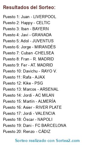 Lista de participantes: Jordi - AC MILAN, Rafa - AJAX, Martín - ALMERÍA, Marcos - ARSENAL, Fer - AT. MADRID, Iban - BAYERN, Happy - CELTIC, Cuban -CHELSEA, Renzo - CÁDIZ, Dani - FC BARCELONA, Javi - GRANADA, Adol - JUVENTUS, Juan - LIVERPOOL, Jorge - MIRANDÉS, Óscar - NAPOLI, Kike - PSG, Fran - R. MADRID, Davichu - RAYO V., Asier - RIVER PLATE, Jordi - VALENCIA.