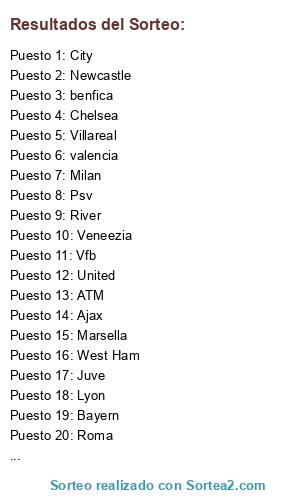 Lista de participantes: valencia, Newcastle, Marsella, benfica, Chelsea, Milan, River, Juve, Ajax, Arsenal, City, Lyon, West Ham, Veneezia, Villareal, Psv, ATM, Roma, United, Bayern, PSG, Vfb.