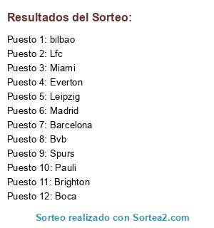 Lista de participantes: Spurs, Lfc, bilbao, Brighton, Madrid, Bvb, Barcelona, Everton, Boca, Leipzig, Pauli, Miami.