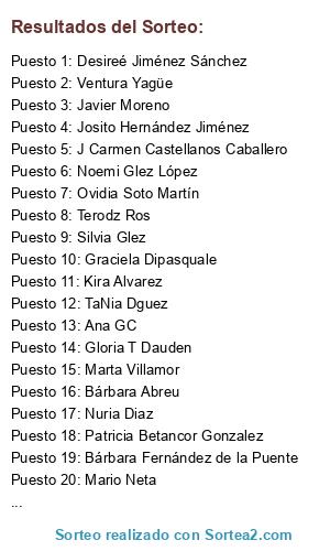Lista de participantes: J Carmen Castellanos Caballero, Ana Romero Rodríguez, Javier Moreno, Ana GC, Desireé Jiménez Sánchez, Patricia Betancor Gonzalez, Bárbara Fernández de la Puente, Ventura Yagüe, Terodz Ros, Bárbara Abreu, María José Cabeza, Nuria Diaz, Ovidia Soto Martín, Mario Neta, TaNia Dguez, Silvia Glez, Gloria T Dauden, Olga Cruz, Marta Villamor, Nuria Espinosa, Laura Trujillo, Noemi Glez López, Josito Hernández Jiménez, Nataly Parra Colimil, Toni Lemus, Ester Sin H, Graciela Dipasquale, Kira Alvarez.