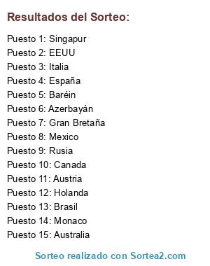 Lista de participantes: Australia, Baréin, Vietnam, China, Holanda, España, Monaco, Azerbayán, Canada, Francia, Austria, Gran Bretaña, Hungría, Belgica, Italia, Singapur, Rusia, Japón, EEUU, Mexico, Brasil, Abu Dabi.
