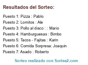 Lista de participantes: Asado : Roberto, Pollo al disco : : Mario, Pizza : Pablo, Hamburguesas : Bimbo, Tacos - Fajitas : Karin, Lomitos : Ale, Comida Sorpresa: Joaquin.