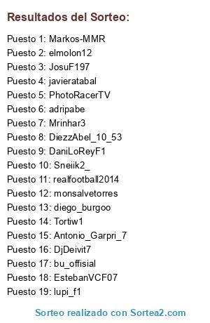 Lista de participantes: bu_offisial, EstebanVCF07, JosuF197, Sneiik2_, elmolon12, Tortiw1, DaniLoReyF1, PhotoRacerTV, Markos-MMR, diego_burgoo, monsalvetorres, adripabe, DjDeivit7, javieratabal, realfootball2014, Mrinhar3, Antonio_Garpri_7, lupi_f1, DiezzAbel_10_53.