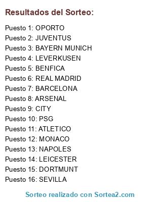 Lista de participantes: ARSENAL, NAPOLES, BARCELONA, ATLETICO, MONACO, DORTMUNT, LEICESTER, JUVENTUS, PSG, BENFICA, CITY, BAYERN MUNICH, LEVERKUSEN, REAL MADRID, OPORTO, SEVILLA.
