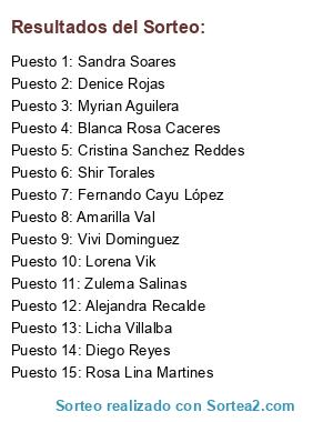 Lista de participantes: Alejandra Recalde, Cristina Sanchez Reddes, Vivi Dominguez, Lorena Vik, Fernando Cayu López, Amarilla Val, Sandra Soares (2), Zulema Salinas, Blanca Rosa Caceres(3), Diego Reyes, Denice Rojas, Licha Villalba, Shir Torales, Myrian Aguilera, Rosa Lina Martines.