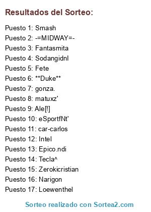 Lista de participantes: eSportfNt' , **Duke** , Loewenthel , Smash (2 participaciones), Fete (2 participaciones), Narigon , Zerokicristian , Epico.ndi (2 participaciones), gonza. (2 participaciones), Tecla^ , car-carlos , Fantasmita , matuxz' , Ale[!] , SodangidnI , Intel , -=MIDWAY=-.