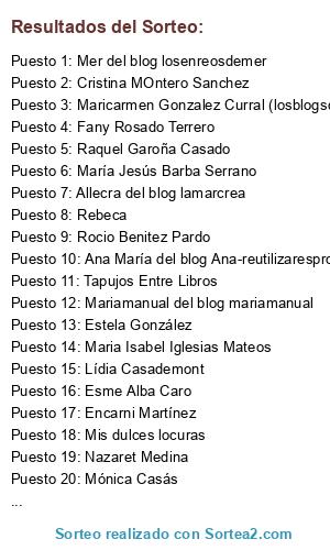 Lista de participantes: Laura Barrena (2 participaciones), Fany Rosado Terrero (2 participaciones), Mamme Mota Martinez, Estela González (2 participaciones), Isabel Rodríguez, Mónica Casás (2 participaciones), Esther Magariño Pedreño, Cristina Moreno, Noelia Moreno, Mawi Gutiérrez Fdez Cuervo, Maria Isabel Iglesias Mateos, Mari Carmen Ruibal, Afri Iglesias, Isa Mota, Yaiza Piñeiro, Cristina MOntero Sanchez, Raquel Garoña Casado, Lídia Casademont, Sara Rodriguez, Rocio Benitez Pardo, María Jesús Barba Serrano (2 participaciones), Esme Alba Caro, Nazaret Medina (2 participaciones), Angeles Ramos, EmmayDaylos Perez, Dulces Lyly (2 participaciones), Tapujos Entre Libros (2 participaciones), Mariamanual del blog mariamanual, Bahema del blog dragonflybahema (2 participaciones), Maricarmen Gonzalez Curral (losblogsdeMaría) (2 participaciones), Ana María del blog Ana-reutilizaresprogresar) (2 participaciones), Allecra del blog lamarcrea (2 participaciones), Fiesta de cuquis, Artefriki (2 participaciones), Alsa (Sandra), Gema del blog micaenlacocina (2 participaciones), Seño Mariló del blog mariloysusnenes, Silvia, Maricarmen (2 participaciones), Rebeca (2 participaciones), Encarni Martínez (2 participaciones), Marisa Ortiz del blog misjabonesdelpueblo (2 participaciones), Maria Jesus Illazquez Pereira (2 participaciones), Mis dulces locuras, Mer del blog losenreosdemer (2 participaciones), Conchi del blog lacasadelasconchitas, Kika, Marian Corral del blog entrehilosyencinas (2 participaciones), Vicky del blog larrobadevicky, Lourdes del blog puntdecreu-lola (2 participaciones), Claudia Cantillo del blog Kanpalasartc , Claudia Cantillo del blog Kanpalasartc.