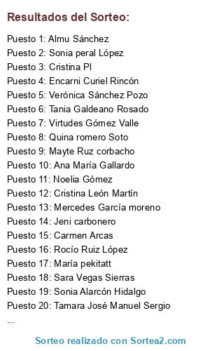 Lista de participantes: Verónica Sánchez Pozo, Noelia Gómez, Cristina León Martín, Laura Jiménez moreno, Ana Belén mora Castañeda, Jeni carbonero, Belén Acedo romero, Virtudes Gómez valle, Carmen Arcas, Tere Martín castillo, Mayte Ruz corbacho, Mayte Gómez, Virtudes Gómez Valle, Laura Pérez Fernández, Encarni Curiel Rincón, Sandra Hidalgo, Sara Vegas Sierras, Pili Ruiz casado, Mónica alcaide García, Sheila García García, Sonia Alarcón Hidalgo, Rocío Ruiz López, Almu Sánchez, María pekitatt, Morena Ruiz, María Ruiz Macías, Sonia peral López, Andrea morales arce, Susana Lara Garrido, Quina romero Soto, Mercedes García moreno, Tamara José Manuel Sergio, Cristina Pl, Noemí Shelby, Ana María Gallardo, Tania Galdeano Rosado, Jennifer Garrido Gil, Rocío ríos morales.