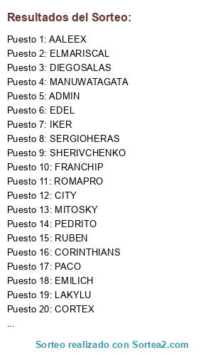 Lista de participantes: PEDRO22, IKER, SHERIVCHENKO, EDEL, EMILICH, GRALLERU, LAKYLU, ROMAPRO, CORINTHIANS, PACO, CORTEX, FRANCHIP, BRASI, RUBEN, PEDRITO, MITOSKY, SERGIOHERAS, ELMARISCAL, CITY, ADMIN, AALEEX, BANANAS, DIEGOSALAS, MANUWATAGATA.