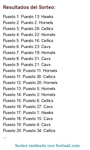Lista de participantes: Puesto 1: Hawks, Puesto 2: Hornets, Puesto 3: Hornets, Puesto 4: Cavs, Puesto 5: Hornets, Puesto 6: Celtics, Puesto 7: Cavs, Puesto 8: Hawks, Puesto 9: Hawks, Puesto 10: Hornets, Puesto 11: Hornets, Puesto 12: Hawks, Puesto 13: Hawks, Puesto 14: Hawks, Puesto 15: Cavs, Puesto 16: Celtics, Puesto 17: Cavs, Puesto 18: Hawks, Puesto 19: Hornets, Puesto 20: Hornets, Puesto 21: Cavs, Puesto 22: Celtics, Puesto 23: Cavs, Puesto 24: Celtics, Puesto 25: Hawks, Puesto 26: Cavs, Puesto 27: Cavs, Puesto 28: Celtics, Puesto 29: Hornets, Puesto 30: Celtics, Puesto 31: Cavs, Puesto 32: Hornets, Puesto 33: Cavs, Puesto 34: Celtics.