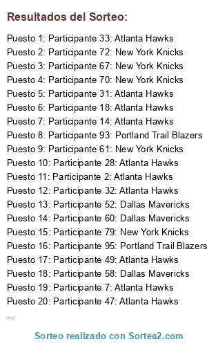 Lista de participantes: Participante 1: Atlanta Hawks, Participante 2: Atlanta Hawks, Participante 3: Atlanta Hawks, Participante 4: Atlanta Hawks, Participante 5: Atlanta Hawks, Participante 6: Atlanta Hawks, Participante 7: Atlanta Hawks, Participante 8: Atlanta Hawks, Participante 9: Atlanta Hawks, Participante 10: Atlanta Hawks, Participante 11: Atlanta Hawks, Participante 12: Atlanta Hawks, Participante 13: Atlanta Hawks, Participante 14: Atlanta Hawks, Participante 15: Atlanta Hawks, Participante 16: Atlanta Hawks, Participante 17: Atlanta Hawks, Participante 18: Atlanta Hawks, Participante 19: Atlanta Hawks, Participante 20: Atlanta Hawks, Participante 21: Atlanta Hawks, Participante 22: Atlanta Hawks, Participante 23: Atlanta Hawks, Participante 24: Atlanta Hawks, Participante 25: Atlanta Hawks, Participante 26: Atlanta Hawks, Participante 27: Atlanta Hawks, Participante 28: Atlanta Hawks, Participante 29: Atlanta Hawks, Participante 30: Atlanta Hawks, Participante 31: Atlanta Hawks, Participante 32: Atlanta Hawks, Participante 33: Atlanta Hawks, Participante 34: Atlanta Hawks, Participante 35: Atlanta Hawks, Participante 36: Atlanta Hawks, Participante 37: Atlanta Hawks, Participante 38: Atlanta Hawks, Participante 39: Atlanta Hawks, Participante 40: Atlanta Hawks, Participante 41: Atlanta Hawks, Participante 42: Atlanta Hawks, Participante 43: Atlanta Hawks, Participante 44: Atlanta Hawks, Participante 45: Atlanta Hawks, Participante 46: Atlanta Hawks, Participante 47: Atlanta Hawks, Participante 48: Atlanta Hawks, Participante 49: Atlanta Hawks, Participante 50: Dallas Mavericks, Participante 51: Dallas Mavericks, Participante 52: Dallas Mavericks, Participante 53: Dallas Mavericks, Participante 54: Dallas Mavericks, Participante 55: Dallas Mavericks, Participante 56: Dallas Mavericks, Participante 57: Dallas Mavericks, Participante 58: Dallas Mavericks, Participante 59: Dallas Mavericks, Participante 60: Dallas Mavericks, Participante 61: New York Knicks, Participante 62: New York Knicks, Participante 63: New York Knicks, Participante 64: New York Knicks, Participante 65: New York Knicks, Participante 66: New York Knicks, Participante 67: New York Knicks, Participante 68: New York Knicks, Participante 69: New York Knicks, Participante 70: New York Knicks, Participante 71: New York Knicks, Participante 72: New York Knicks, Participante 73: New York Knicks, Participante 74: New York Knicks, Participante 75: New York Knicks, Participante 76: New York Knicks, Participante 77: New York Knicks, Participante 78: New York Knicks, Participante 79: New York Knicks, Participante 80: New York Knicks, Participante 81: New York Knicks, Participante 82: New York Knicks, Participante 83: New York Knicks, Participante 84: New York Knicks, Participante 85: New York Knicks, Participante 86: New York Knicks, Participante 87: New York Knicks, Participante 88: New York Knicks, Participante 89: New York Knicks, Participante 90: Portland Trail Blazers, Participante 91: Portland Trail Blazers, Participante 92: Portland Trail Blazers, Participante 93: Portland Trail Blazers, Participante 94: Portland Trail Blazers, Participante 95: Portland Trail Blazers, Participante 96: Portland Trail Blazers, Participante 97: Portland Trail Blazers, Participante 98: Portland Trail Blazers, Participante 99: Portland Trail Blazers, Participante 100: Portland Trail Blazers.