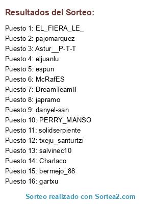 Lista de participantes: Astur__P-T-T, bermejo_88, Charlaco, danyel-san, DreamTeamII, EL_FIERA_LE_, eljuanlu, espun, gartxu, japramo, McRafES, pajomarquez, PERRY_MANSO, salvinec10, solidserpiente, txeju_santurtzi.
