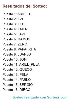 Lista de participantes: PAPAFRITA, EZE, RAMON, DIEGO, FEDE, JONI, ARIEL_PELA, PABLO, EMER, JAVI, ZERO, ARIEL_S, SERGIO, PELA, JUANJO, QUECO.
