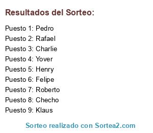 Lista de participantes: Henry, Roberto, Yover, Checho, Rafael, Pedro, Klaus, Felipe, Charlie.