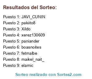 Lista de participantes: pakiito8, xerez130609, elamic, maikel_nait_, JAVI_CUNIN, fetmalbe, boasnoites, Xildo, paniander.