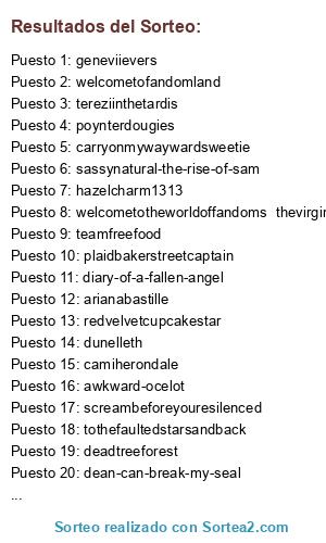 Lista de participantes: diary-of-a-fallen-angel (6 participaciones), sea-smith (4 participaciones), screambeforeyouresilenced, booksaretheway, damnitdestiel, eternallyconfusedforever, 16-tauri, fallencasitel (3 participaciones), sherlockbels, omgspacecat, petewhyntz (3 participaciones), billsmile, demon-of-the-crossroads, illyriacousland (2 participaciones), paczadzinka, selma-is-superwholocked, llamas-like-custard, the-angels-have--the-phone-box, my-creep-tnight, nerds-in-the-tardis, percabeth-inthe-tardis, merry-smokekraken, musicxartxlife, consultingtimetravelingdetective, i-am-fangirl-hear-me-squeal, canyoufeelitfrommyenergy, flyingonmydragon, cityofathena, exorcizamusspiritus, grimmzai, izzyallerdyce, redvelvetcupcakestar (3 participaciones), hedgehogdrinkingorangejuice (3 participaciones), gamingknights (2 participaciones), sherlocks-moriartea, sweerandiaries, shaudek, galaxy-defender94, sassynatural-the-rise-of-sam (4 participaciones), wtflotta (2 participaciones), superwholockhead-willseespace (2 participaciones), theclockworkgirl (2 participaciones), gatosby, thisislokisdivision (3 participaciones), chouchou-san, dunelleth, thepainofthefeels, 67-chevy-tardis, doctor-cumberbitch-who (3 participaciones), nat5h, just-a-fixed-point-in-time, poynterdougies (2 participaciones), justmeandthethingsilike (5 participaciones), geneviievers (3 participaciones), it-doesnt-really-matter (2 participaciones), nativajade, asylum-of-the-angels (5 participaciones), arianabastille, lokid-by-a-demon-hunting-doctor (6 participaciones), belledietrich, mymooseromance (4 participaciones), captain-hollybobolly, an-ni-ka (4 participaciones), sapphirechildxd, hoppusly, canyougetitfrommyenergy (3 participaciones), fuckingelves, ahatian (4 participaciones), hazelcharm1313 (3 participaciones), hola-mon-frere, 7brokenwings (2 participaciones), yabonghigh (2 participaciones), acatastrophicbitch, octuse, welcometofandomland (2 participaciones), livelongandreadbooks (3 participaciones), bellsjinglecatsmeow (2 participaciones), stichesandplugs (2 participaciones), xxswishswishstabxx, dozens-of-fandoms-one-url (2 participaciones), breathedeepandbelieve (2 participaciones), whitetrashgirl, spookyspies, tonielle, never-been-sane, klarolineforlife, holiday-assbutts (2 participaciones), mscoldcoffee (2 participaciones), jeneuwzz (2 participaciones), cicifarr(2 participaciones), asparkofmyimagination, timelord-the-clown, lknowmagicwhenlseeit (2 participaciones), doctorsnightmare (2 participaciones), carryonmywaywardsweetie, teddynaspn89 (2 participaciones), maljoylove, ollytheoshawott, mattressdance, sherlock-fox, notkyokyo (2 participaciones), codependentwinchesterbros, stilesticleright, soullesscrow, johnhamish-watson (2 participaciones), officialdrpepperten (2 participaciones), alltimemoose (3 participaciones), badsvibe (2 participaciones), youveleft-me (2 participaciones), moriartyisat221b, captain-tamashi, guavabutts, tothefaultedstarsandback (2 participaciones), blueeyesandpeircings, imtooweirdtoorare, a-cuppa-for-me, veyesatropykal, rockingthesexynerd, deansnecklaceandbaby, i-wanna-fuck-jensen-ackles, tereziinthetardis (2 participaciones), the-fandom-initiative, mirtheinsane (2 participaciones), touchthenoise, whenyoucantsleepatnight15, silver-bride (2 participaciones), vomiting-unicorn, reinqueergamesinthetardis, dean-can-break-my-seal (2 participaciones), coppercurls-in-the-impala (2 participaciones), camiherondale, carryonmywawardsam (3 participaciones), misha-the-antichrist, eileen4991, carlislecurls, awesomevertigo (2 participaciones), readmylips0 (3 participaciones), ofchaosanddelusions, thediceofprawn, ateenageeternity, ivegotsomebigdreams, districtbbc, shewantsthejensen, southielovino, cumber-collectable, i-onlykissheroesandwinchesters, omniciently (2 participaciones), heyimlookingupformcfly, crowleyhelloboys, 5averockandroll, likeab-o-s-s (2 participaciones), stefuhneekayyy, haveaverypotterchristmas, deadtreeforest (2 participaciones), alcohol-food-life, dean-can-impala-me-any-day (2 participaciones), sueishappy, faukesmusing, pottermcfly5, beyondtwowinchesters, imafrackingfanwarrior, jimmy-novaq, partcrazy, i-love-jensen-ackles, captainchekov, kitsiecake, veeryvictoria, sabrinarodone831, strangesparkling indesperateneedofanurl, thenerkleadergenesisgreene (2 participaciones), mitula-caprope, giraffeinthetardis, blackwidow1369, cadaver-jane-doe, within-this-darkness, teamfreefood, juice1197 (2 participaciones), cumber-hiddle, superwholock-ed, sammymooseychester, marlenesdeadmuffin, stormyhael, deanwantscasintheass, doctor-saves-castiel, plaidbakerstreetcaptain, toothpast, kripke-is-my-king, gymleader-blaine, angelsofletters (2 participaciones), citrusfebreeze, winchesters-in-the-police-box, awkward-ocelot, littlefuckedupred, blue-sunshine93, punk-rock-suicide, legendofstuerzl, welcometotheworldoffandoms thevirginsuicidess, juistin, imaginesnowmansulu, iwatch-thebees, timelordwithatimeturner, bowsgowitheverything, potaitum.