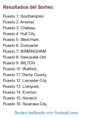 Lista de participantes: Chelsea,, Southampton, Derby County,, Swansea City,, Watford,, MILTON, Liverpool,, Hull City, Newcastle Utd, West Ham., Leicester City,, Arsenal,, Everton,, BIRMINGHAM, Doncaster, Norwich.