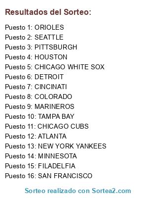 Lista de participantes: HOUSTON, COLORADO, SAN FRANCISCO, ATLANTA, DETROIT, TAMPA BAY, MINNESOTA, SEATTLE, FILADELFIA, CINCINATI, PITTSBURGH, CHICAGO CUBS, NEW YORK YANKEES, CHICAGO WHITE SOX, ORIOLES, MARINEROS.