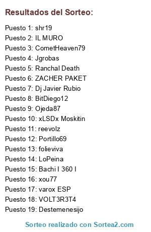 Lista de participantes: BitDiego12, Ojeda87, shr19, xou77, varox ESP, Portillo69, VOLT3R3T4, ZACHER PAKET, Ranchal Death, LoPeina, CometHeaven79, Destemenesijo, IL MURO, folieviva, Dj Javier Rubio, reevolz, Bachi I 360 I, Jgrobas, xLSDx Moskitin.