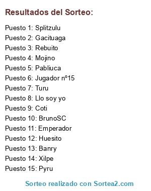 Lista de participantes: Splitzulu, Pyru, Llo soy yo, BrunoSC, Turu, Coti, Xilpe, Emperador, Banry, Rebuito, Gacituaga, Mojino, Huesito, Pabliuca, Jugador nº15.