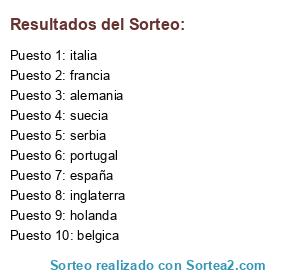 Lista de participantes: españa, inglaterra, francia, italia, alemania, holanda, portugal, serbia, belgica, suecia.