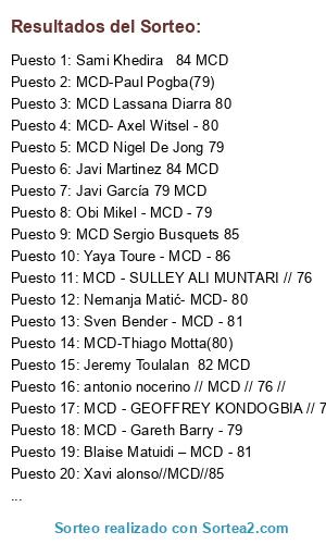 Lista de participantes: Nemanja Matić- MCD- 80 , Yaya Toure - MCD - 86, Sven Bender - MCD - 81, MCD - GEOFFREY KONDOGBIA // 78, MCD - SULLEY ALI MUNTARI // 76, Xavi alonso//MCD//85, José Paulo Bezerra(Paulinho) MCD /81 //, antonio nocerino // MCD // 76 //, Yann M´vila - MCD - 79, Blaise Matuidi – MCD - 81, Jeremy Toulalan 82 MCD, MCD Nigel De Jong 79, MCD Sergio Busquets 85, MCD-Thiago Motta(80), MCD-Paul Pogba(79), MCD-Mohamed Sissoko(75), Javi Martinez 84 MCD, MCD - Felipe Melo - 82, MCD - Scott Matthew Parker - 79, MCD- Axel Witsel - 80, MCD Lassana Diarra 80, MCD Mario suarez mata 79, Bastian Schweinsteiger - MCD - 88, Javi García 79 MCD, Sami Khedira 84 MCD , Obi Mikel - MCD - 79, MCD - Rio Mavuba - 81, MCD - Gareth Barry - 79.