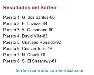 Lista de participantes: Cristiano Ronaldo-92, S. El Shaarawy-81, A. Griezmann-80, David Villa-83, G. dos Santos-80, Cristian Tello-79, E. Lavezzi-84, N. Chadli-78.