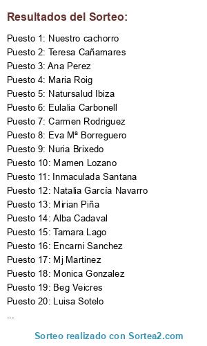 Lista de participantes: Ana Perez, Inmaculada Santana, Mj Martinez, Susana Gonzalez, Carmen Rodriguez, Encarni Sanchez, Nuria Brixedo, Eulalia Carbonell(2 participaciones), Mirian Piña, Nuria García, Teresa Cañamares, Nuestro cachorro(2 participaciones), Maria Roig(2 participaciones), Beg Veicres, Andrea Sanchez, Alba Cadaval, Mamen Lozano, Tamara Lago, Natursalud Ibiza(2 participaciones), Natalia García Navarro, Luisa Sotelo, Eva Mª Borreguero, Monica Gonzalez(2 participaciones), Katerina K(2 participaciones).