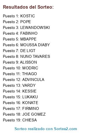 Lista de participantes: ALISSON, POPE, DE LIGT, JOE GOMEZ, KONATE, ADVINCULA, NUNO TAVARES, KOSTIC, FABINHO, KESSIE, THIAGO, LUKAKU, LEWANDOWSKI, FIRMINO, CHIESA, MBAPPE, MOUSSA DIABY, VARDY, MODRIC.