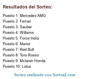 Lista de participantes: Mercedes AMG, Ferrari, Red Bull, Williams, Lotus, Toro Rosso, Force India, Sauber, Mclaren Honda, Manor.