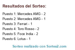 Lista de participantes: Mercedes AMG - 1, Mercedes AMG - 2, Ferrari - 1, Ferrari - 2, Toro Rosso - 1, Toro Rosso - 2, Lotus - 1, Lotus - 2, Force India - 1, Foce India - 2.
