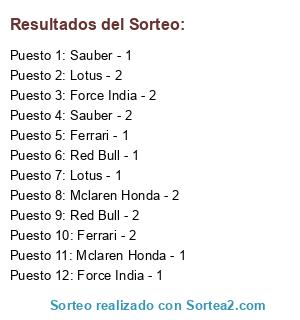 Lista de participantes: Ferrari - 1, Ferrari - 2, Red Bull - 1, Red Bull - 2, Sauber - 1, Sauber - 2, Mclaren Honda - 1, Mclaren Honda - 2, Lotus - 1, Lotus - 2, Force India - 1, Force India - 2.