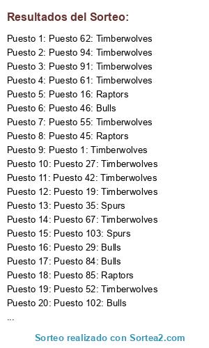Lista de participantes: Puesto 1: Timberwolves, Puesto 2: Timberwolves, Puesto 3: Timberwolves, Puesto 4: Timberwolves, Puesto 5: Bulls, Puesto 6: Raptors, Puesto 7: Raptors, Puesto 8: Timberwolves, Puesto 9: Bulls, Puesto 10: Raptors, Puesto 11: Spurs, Puesto 12: Timberwolves, Puesto 13: Timberwolves, Puesto 14: Timberwolves, Puesto 15: Timberwolves, Puesto 16: Raptors, Puesto 17: Bulls, Puesto 18: Timberwolves, Puesto 19: Timberwolves, Puesto 20: Timberwolves, Puesto 21: Timberwolves, Puesto 22: Timberwolves, Puesto 23: Timberwolves, Puesto 24: Timberwolves, Puesto 25: Timberwolves, Puesto 26: Timberwolves, Puesto 27: Timberwolves, Puesto 28: Timberwolves, Puesto 29: Bulls, Puesto 30: Timberwolves, Puesto 31: Timberwolves, Puesto 32: Spurs, Puesto 33: Spurs, Puesto 34: Bulls, Puesto 35: Spurs, Puesto 36: Raptors, Puesto 37: Timberwolves, Puesto 38: Timberwolves, Puesto 39: Timberwolves, Puesto 40: Timberwolves, Puesto 41: Timberwolves, Puesto 42: Timberwolves, Puesto 43: Timberwolves, Puesto 44: Timberwolves, Puesto 45: Raptors, Puesto 46: Bulls, Puesto 47: Timberwolves, Puesto 48: Timberwolves, Puesto 49: Timberwolves, Puesto 50: Bulls, Puesto 51: Timberwolves, Puesto 52: Timberwolves, Puesto 53: Timberwolves, Puesto 54: Spurs, Puesto 55: Timberwolves, Puesto 56: Spurs, Puesto 57: Timberwolves, Puesto 58: Raptors, Puesto 59: Timberwolves, Puesto 60: Timberwolves, Puesto 61: Timberwolves, Puesto 62: Timberwolves, Puesto 63: Bulls, Puesto 64: Timberwolves, Puesto 65: Bulls, Puesto 66: Raptors, Puesto 67: Timberwolves, Puesto 68: Timberwolves, Puesto 69: Raptors, Puesto 70: Spurs, Puesto 71: Spurs, Puesto 72: Spurs, Puesto 73: Spurs, Puesto 74: Timberwolves, Puesto 75: Raptors, Puesto 76: Timberwolves, Puesto 77: Timberwolves, Puesto 78: Raptors, Puesto 79: Timberwolves, Puesto 80: Timberwolves, Puesto 81: Timberwolves, Puesto 82: Timberwolves, Puesto 83: Timberwolves, Puesto 84: Bulls, Puesto 85: Raptors, Puesto 86: Spurs, Puesto 87: Timberwolves, Puesto 88: Bulls, Puesto 89: Timberwolves, Puesto 90: Spurs, Puesto 91: Timberwolves, Puesto 92: Timberwolves, Puesto 93: Raptors, Puesto 94: Timberwolves, Puesto 95: Timberwolves, Puesto 96: Timberwolves, Puesto 97: Timberwolves, Puesto 98: Timberwolves, Puesto 99: Spurs, Puesto 100: Timberwolves, Puesto 101: Bulls, Puesto 102: Bulls, Puesto 103: Spurs, Puesto 104: Timberwolves, Puesto 105: Timberwolves, Puesto 106: Timberwolves, Puesto 107: Timberwolves, Puesto 108: Timberwolves, Puesto 109: Timberwolves, Puesto 110: Timberwolves, Puesto 111: Bulls.