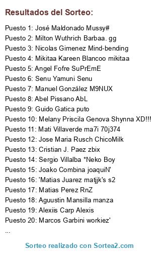 , Feer Centeno ZerO ^^ SkatE:_, LuKaas PoLanco Luuqhz', Joako Combina joaquiN', Oviedo JôÄn ">:3", Danniel Valor L u x o r, Jesus Baez benQ, Ignacio Gonzalez D3F4UL7_xD, Julian Figueroa Z1ON^, MeeLina BeLén *Neko Girl~, Alan Palmieri fiNET' tu uashen again , Agus Sampayo t3rr3c4bio, Agustin Jesus Martinez KRAToS, Tata Lpc TATA, Damian Bz ;g0tzze^, Ivan Blanco El moko pa', Rodoo Solano ReVenGe, Ezequiel Fernandez EzeWow x_o :B, Mee Lúù González MeeLuu, Nachito Cister LEONIDAS, Angel Fofre SuPrEmE, Franco Salazar kUff s2, Nicolas Manzanedo LyoN;, Aguustin Lezcanoo Bugutu^, Cano Juan Nexo TU PAPA JOSE JAJAJA, Alë Jimmenez J4ndru', Niko Estrada eL Craack' 3p!, Mati Villaverde ma7i 70j374, Agustin ssankk, Abel Pissano AbL, Melany Priscila Genova Shynna XD!!!, Alejandro Miller |panzer[1].[6]|, Nicolas Gimenez Mind-bending, Braian Baez Braian, Jose Maria Rusch ChicoMilk, Agus Juarez TONTON QUIERE CHICLON, Tomy Luna cArn